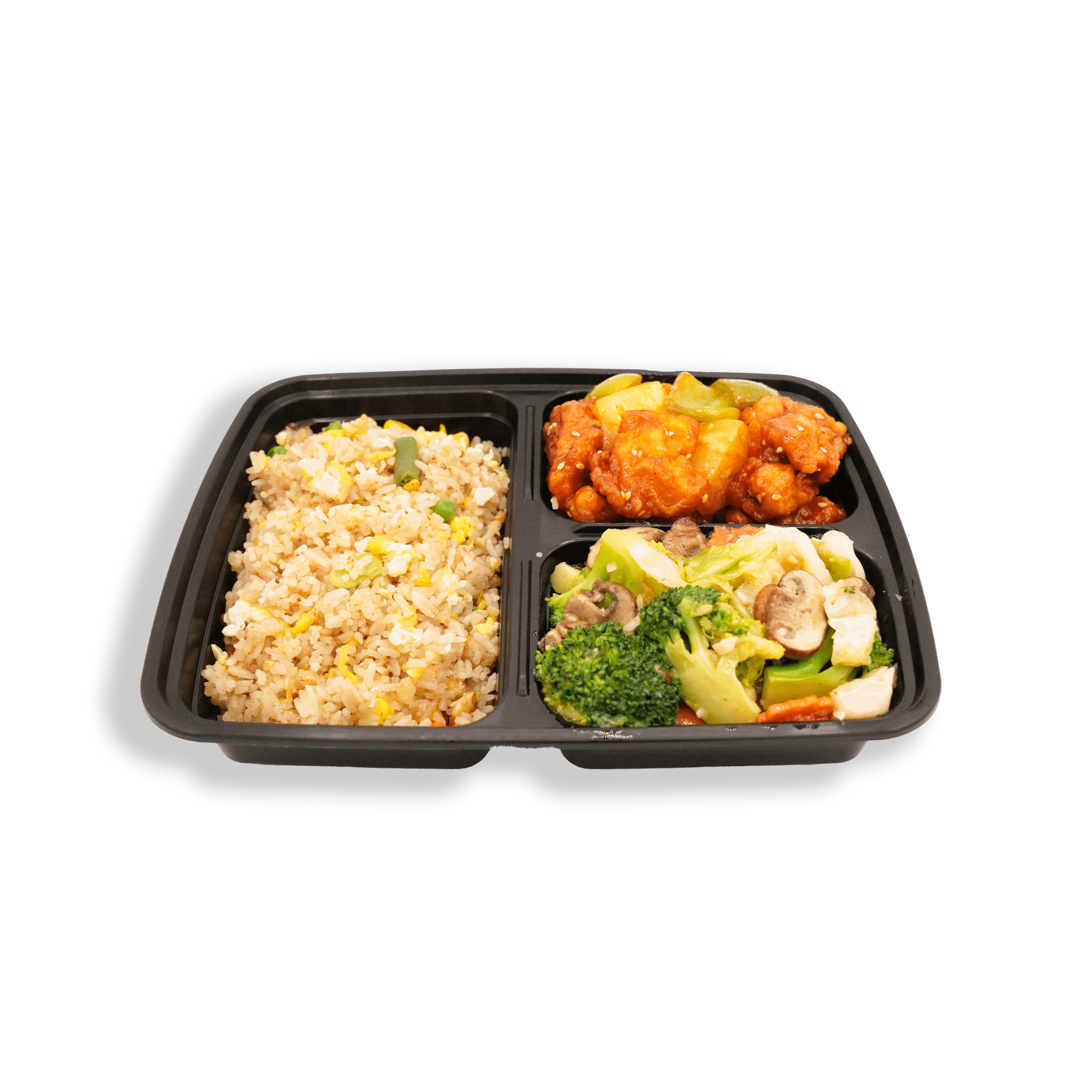 1 side (Jasmine Rice) + 2 entrees Fried Rice, Yaki Soba +$1.00