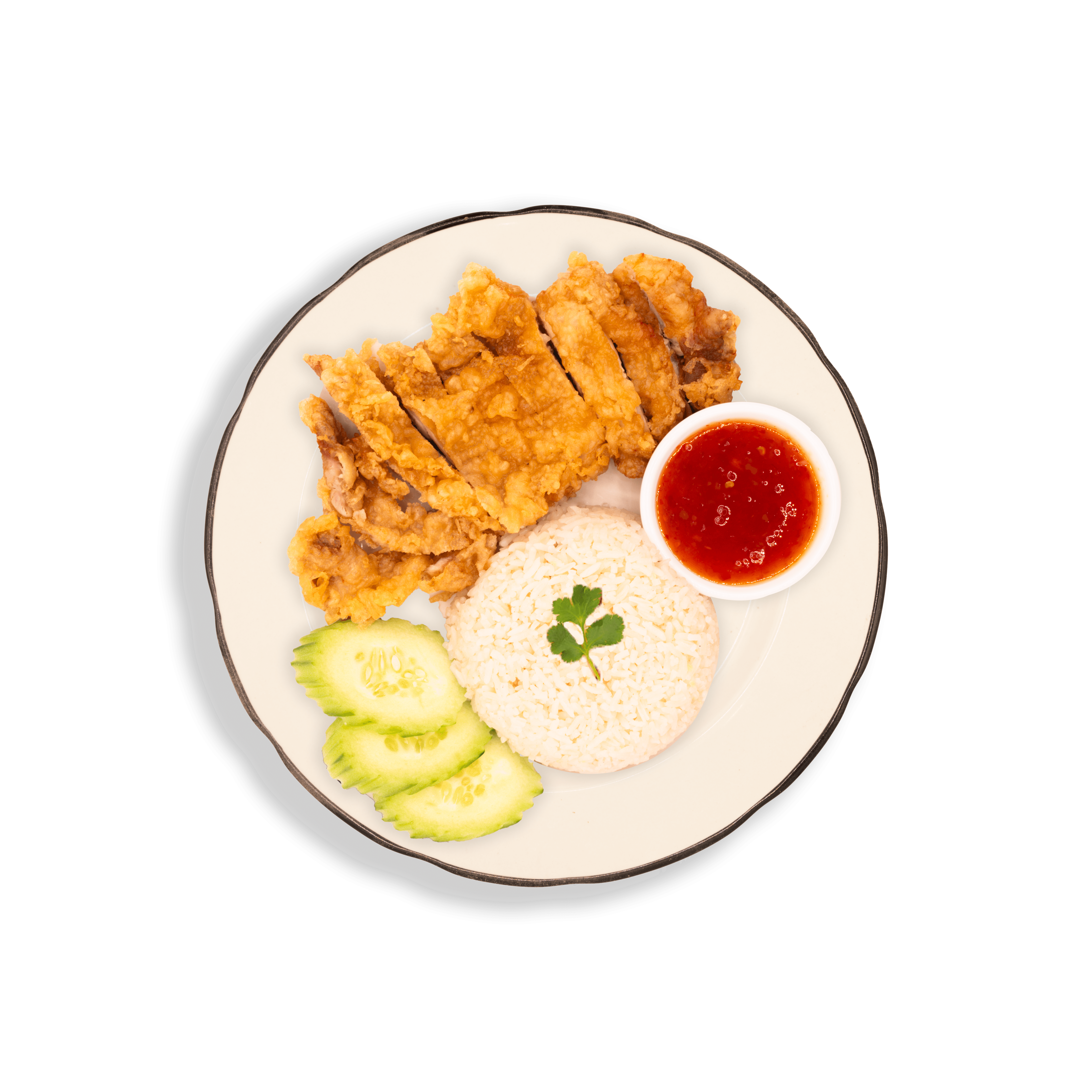 Fried chicken, served with ginger rice, sweet chilli sauce and cucumber