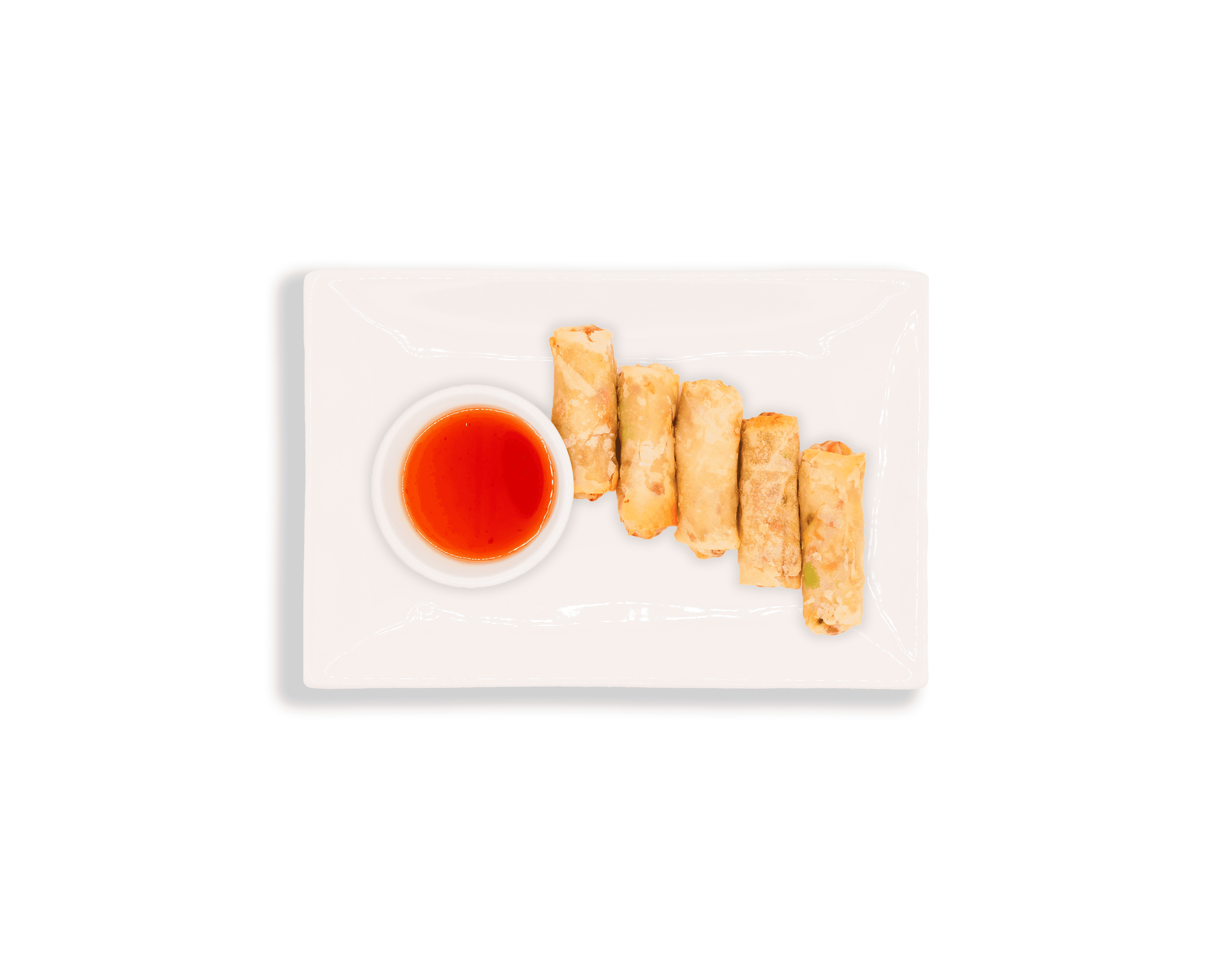 Deep fried vegetable spring rolls with carrot, cabbage, sweet potato, bamboo shoot, onion, jicama, edamame and soy sauce, served with plum sauce.