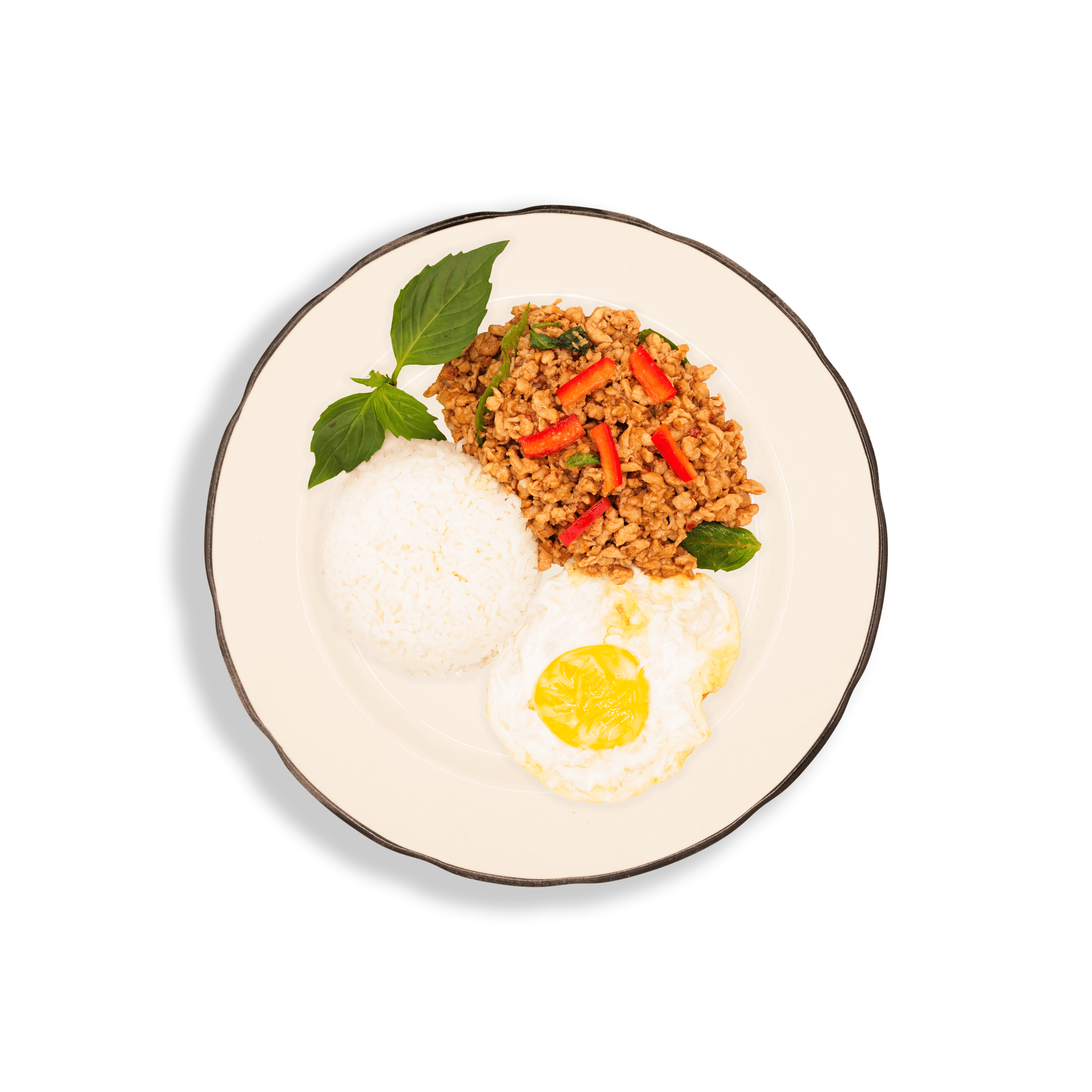 Famous Thai street food dish featuring ground chicken or pork stir-fried with basil and bell peppers, served with steamed rice and fried egg.