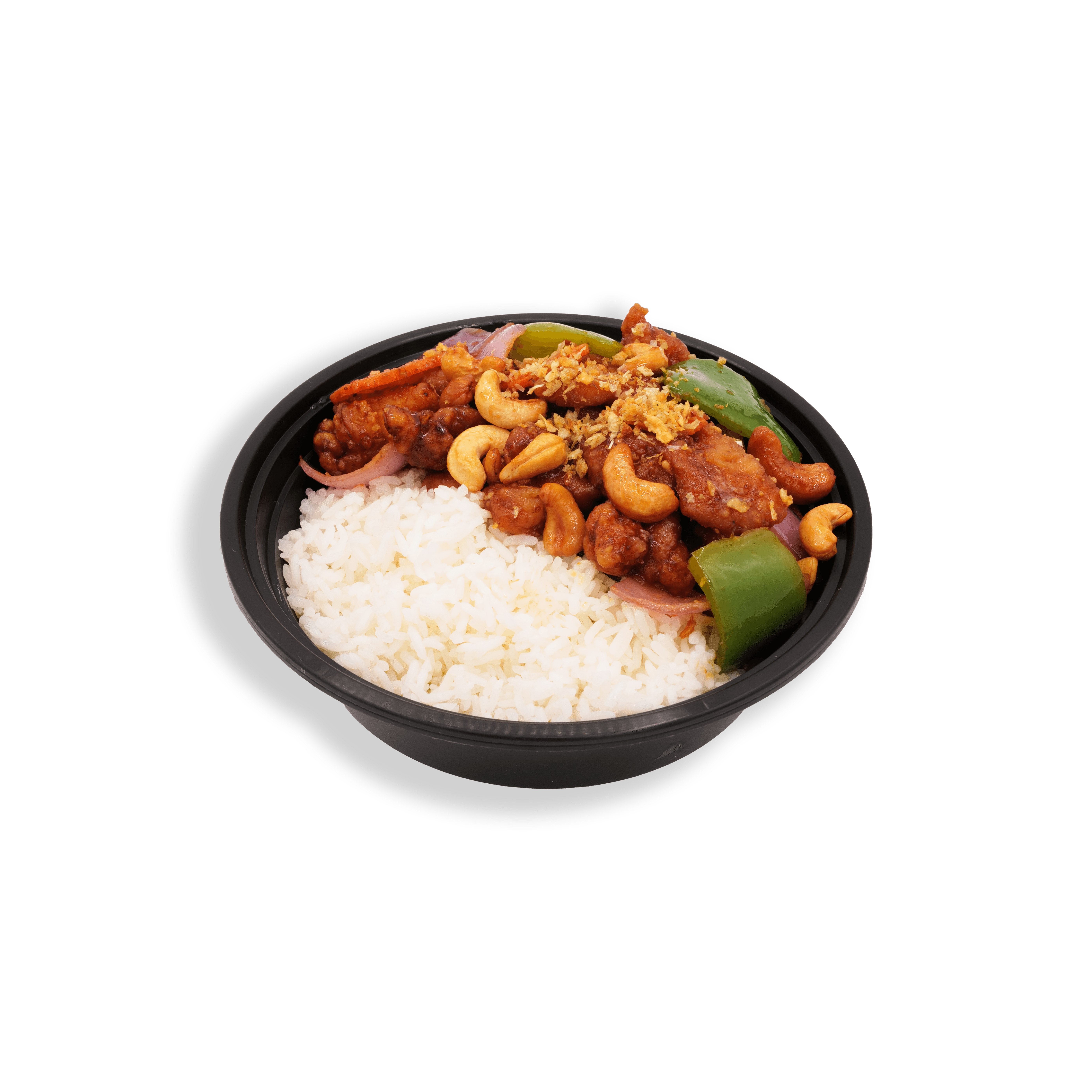 Stir-fried chicken with special chilli sauce and caschew nuts, bell pepper and red onion.