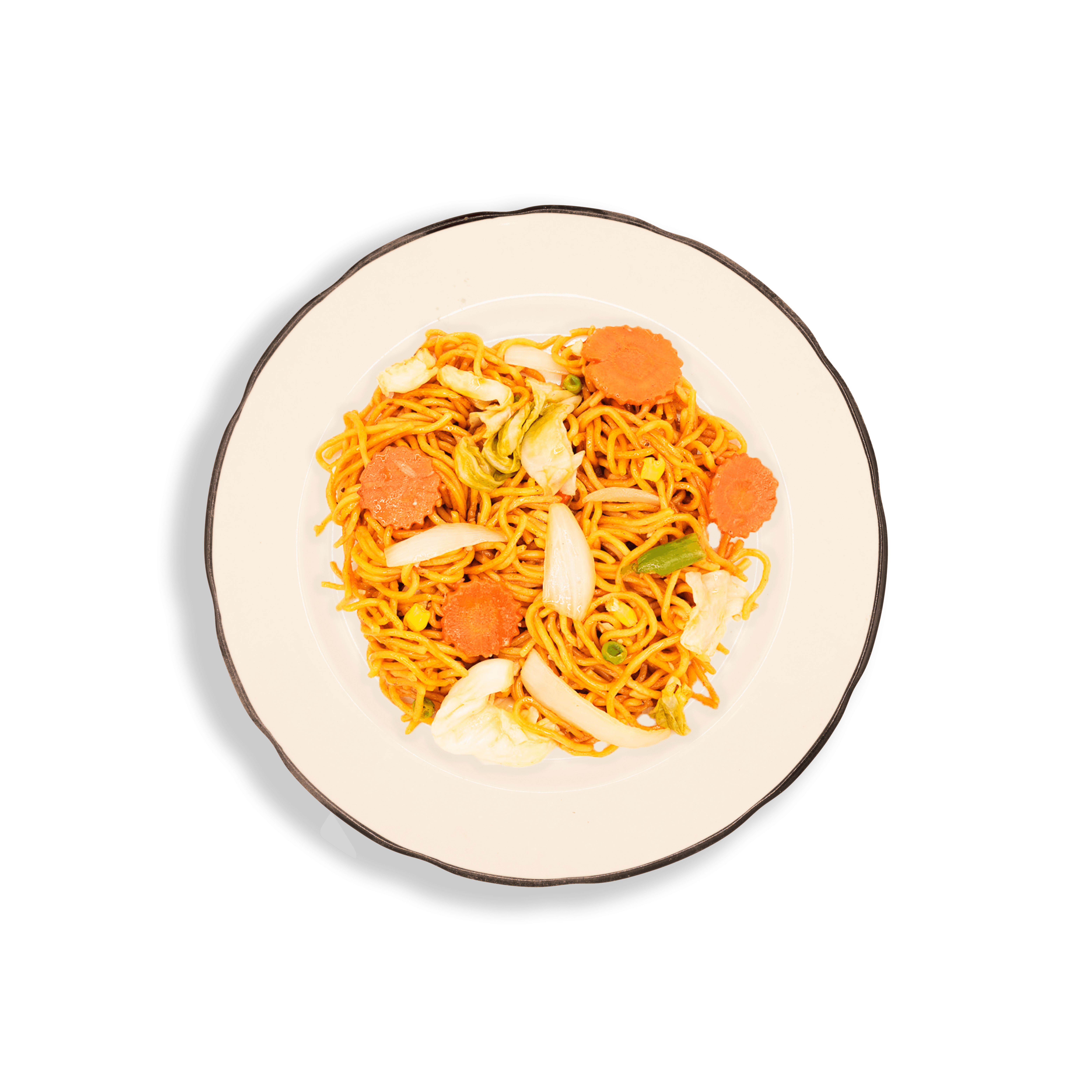 Japanese stir-fried noodle dish with carrot, corn, peas, cabbage, onion and green cabbage.